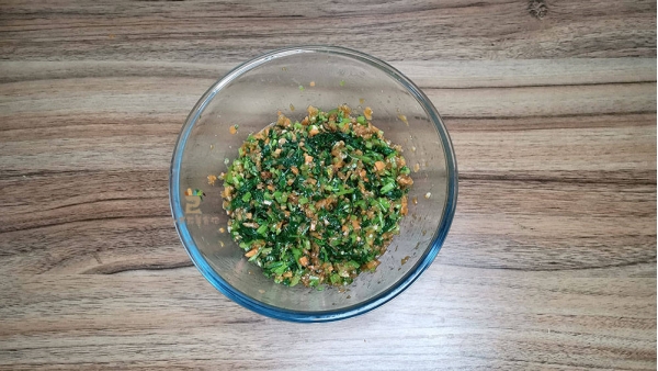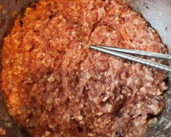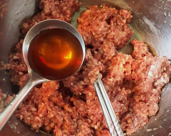 5、将其放到羊肉中,加一点葱花,一点熟油,继续搅匀,均匀混合到肉馅中,就完成了。
