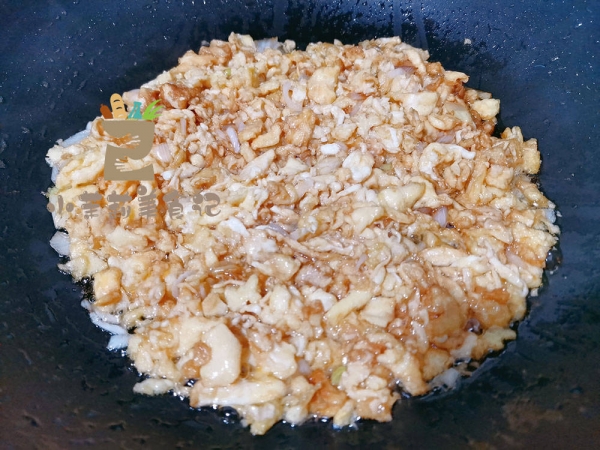 4、鸡蛋2-3枚,先在碗里将其打散,接着将其淋入热油中,快速炒熟,压成小块,接着放葱花,生抽炒香,关火晾凉。