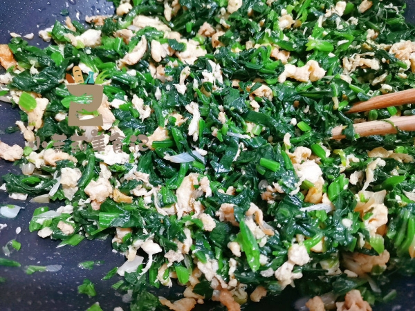 5、菠菜放到里边,先抓散,接着补些盐,继续用快速搅拌入味即可。