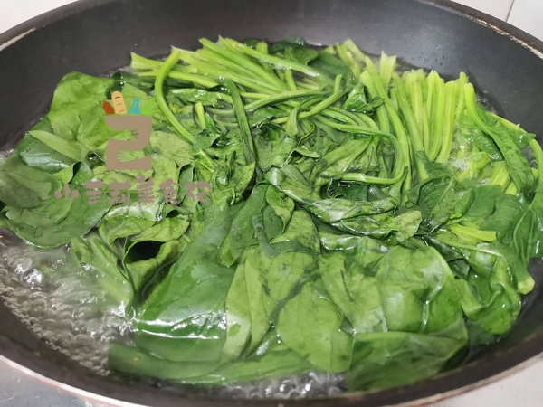 2、烧一大锅热水,挤一滴玉米油进去,把菠菜倒进去,烫一圈后立即夹出晾凉。