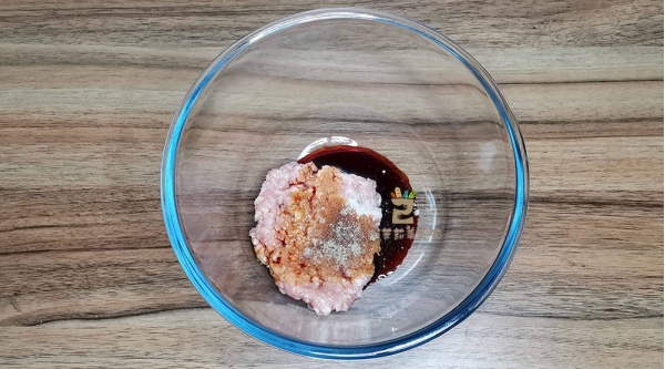 2、接着来准备一些新鲜的猪肉,通过绞肉机绞碎,或是直接剁碎,加生抽,胡椒粉,盐,混合搅匀。