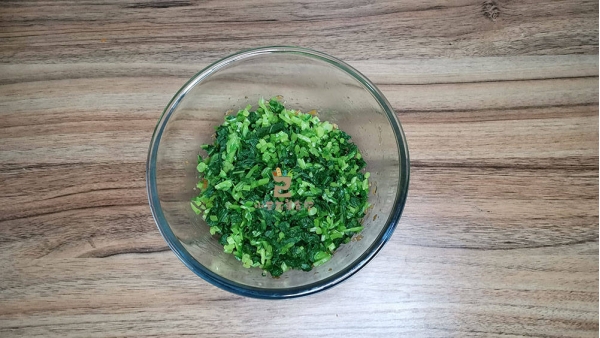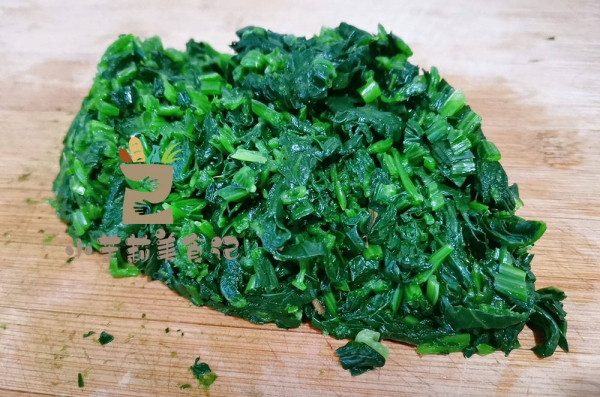 4、将其中的水分攥出,接着放到案板上,进一步切碎。另外再准备些胡萝卜也切碎。