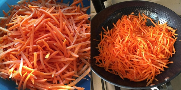 4、胡萝卜两根,先去皮洗净擦成丝,接着在锅中加油,放胡萝卜反复炒到变软。接着盛出,进一步剁碎。