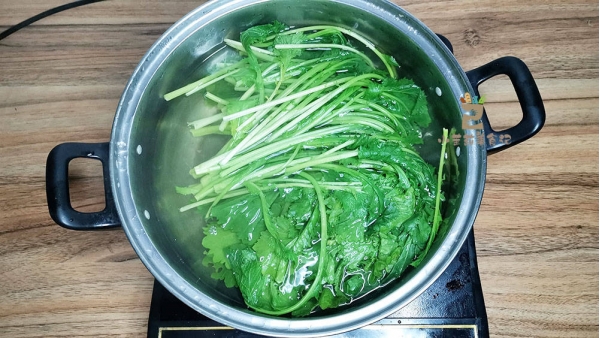3、先将雪里蕻摘一摘,剪掉根须,挑出黄叶,老叶,鲜嫩的部分保留下来,洗干净后,放到开水中烫软,继而捞起过凉。