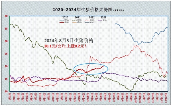 据数据分析,受屠企调价收猪,8月5日,外三元生猪价格出栏均价在20.1元/公斤,环比昨日上涨0.2元/公斤,国内南北地区,猪价呈现全线上涨的走势,主流省区,屠企报价涨幅在0.1~0.3元/公斤,其中,全国生猪均价与湖北、四川地区水平一致!在传统的高低市场,猪价呈现携手上涨的走势!
