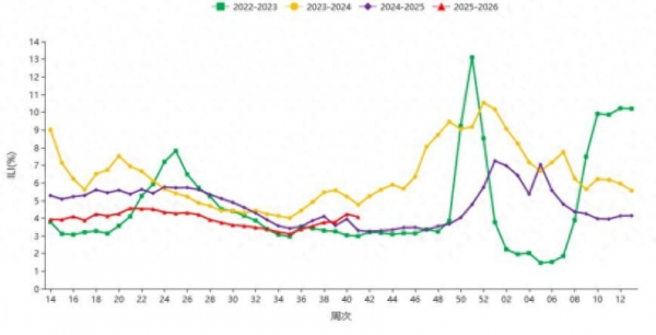 2022~2026年度南方省份哨点医院报告流感样病例,数据来源于国家级哨点医院。图片来自中国疾病预防控制中心。