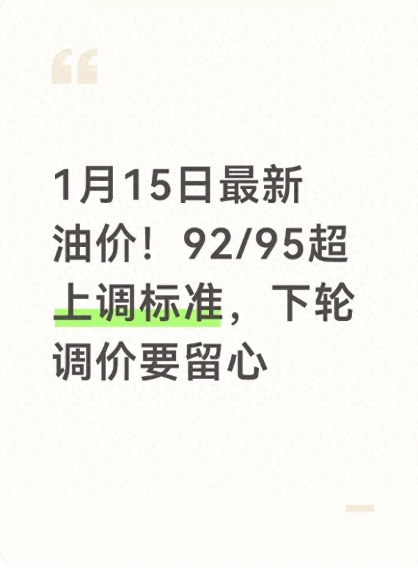 1月15日,不少车主刷到"油价上涨"的消息后都慌了神,纷纷打听当天92号、95号汽油的实际价格。其实不用急着焦虑,目前国内油价还维持着1月6日调价后的水平,并没有出现突然上涨的情况,但下一轮调价确实有了新动向,值得大家提前关注。