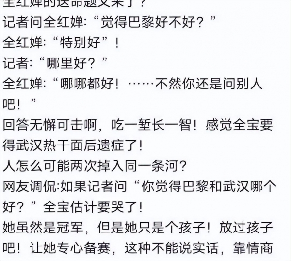不过说真的,一个十几岁的小姑娘,本该无忧无虑地享受青春,为什么要这么小心翼翼呢?想想看,如果记者问:"你觉得巴黎和武汉哪个好?"全红婵该怎么回答?这种问题对一个孩子来说,真的太难了!