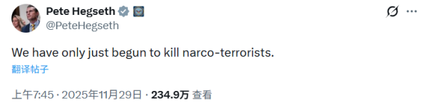 美媒称,在相关报道发布后,赫格塞思于周五在社交媒体发文回应称,"这些高效打击旨在实施'致命动能打击'",并辩称行动"符合美国法律与国际法"。继续保持强硬态度,他还预告称,"打击毒品恐怖分子的行动才刚刚开始。"
