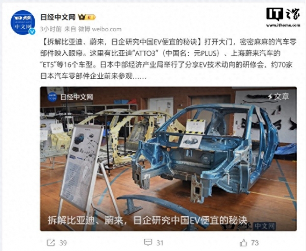 报道称,零部件的通用化和自产化是中国企业能够生产出低价电动汽车的背景。当地此次展示了比亚迪 ATTO 3(IT之家注:国内车型为元 PLUS)、蔚来 ET5、特斯拉 Model Y 等 16 款车型的 9 万余个零部件。