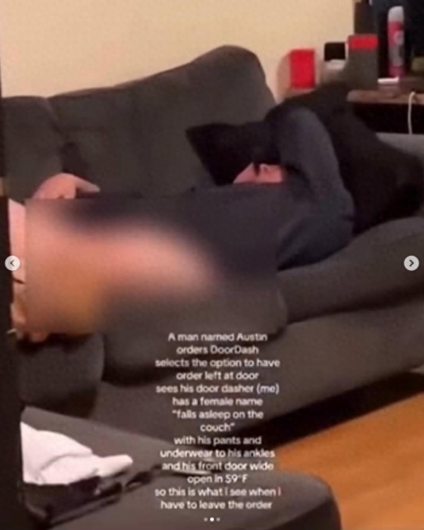 Henderson是一名外卖员,这天,她给一名男子送外卖,到地方却一阵辣眼,因为正对着门口就是一个裸男,裤子褪到脚踝,似乎正在熟睡。