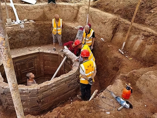 在利用机器探明附近情况与遗迹具体位置后,通过人机结合开采的方法,路维民考古团队功克服了发掘环境恶劣的问题,一件一件的将深埋地底7.5米的尧陵石牌坊发掘而出。