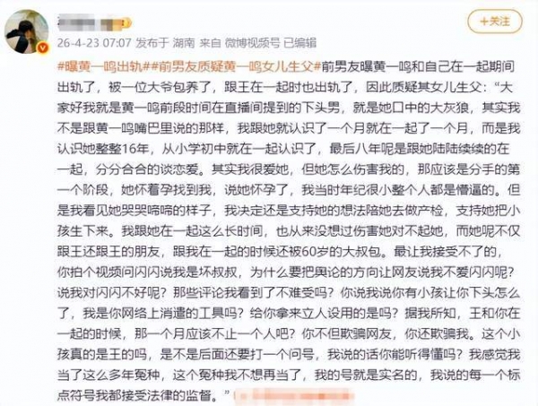 曝光的视频中,这位自称黄一鸣前任的网友表示,他与黄一鸣是小学同学,也就是说两人认识已经整整16年了,由于彼此的矛盾比较久远,所以分分合合多次,而黄一鸣怀孕的时候,正好是两人分手后的第一个阶段。