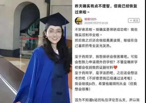 杨某媛的争议始于2025年7月。她曾指控武汉大学同学肖某某在图书馆对其实施"隔空性骚扰",但武汉经开区法院于7月25日一审判决驳回其全部诉讼请求,认定所谓"性骚扰"实为对方下意识挠痒行为,不构成侵权。然而,败诉后的杨某媛不仅未道歉,反而在社交平台公开炫耀其保研、法考通过及获得香港浸会大学博士录取资格,引发舆论哗然。