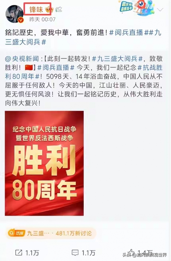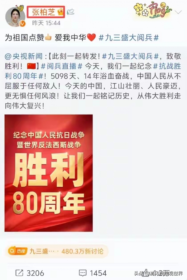 九月三号抗战阅兵那天,港星张柏芝在微博和脸书同步发了阅兵照片,配文为祖国喝彩。