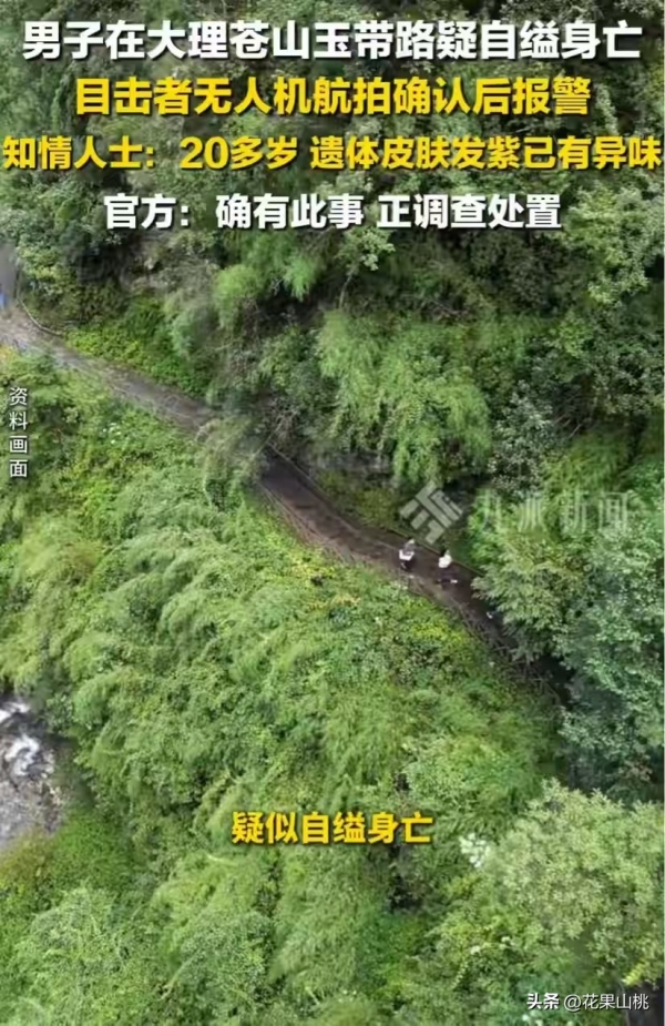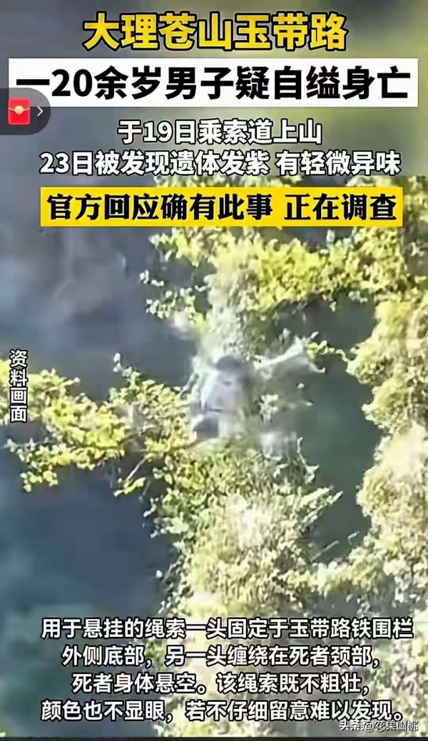 近日,有网友向媒体爆料称,在云南大理苍山玉带路发现疑似有人自缢身亡。