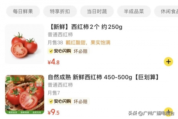 广州的情况如何呢?记者在线上商超看到,500g的番茄价格在10元左右。