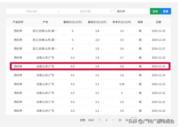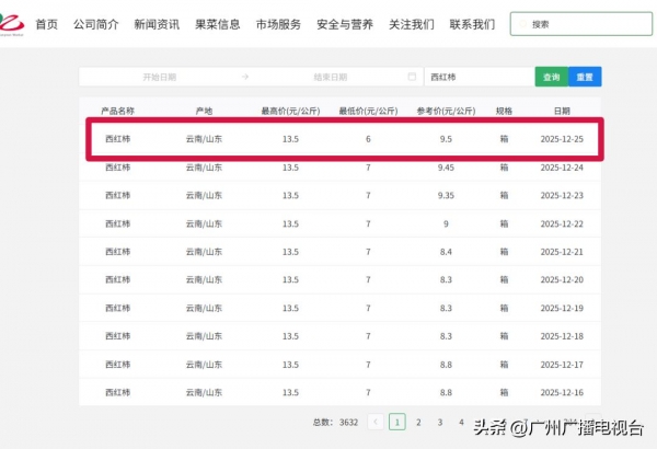 广州江南果菜批发市场是我国果菜销量较大的批发市场之一,记者在其官网看到,12月25日,一公斤的番茄,参考价是9.5元,去年同期的价格是3.8元一公斤,价格上涨明显。