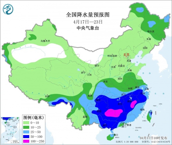 预计未来一周(4月17日至23日),南方地区多降雨,并伴有雷暴大风或冰雹等强对流天气;江南、华南中西部以及重庆、贵州等地累计降水量有50~90毫米,贵州东南部、广西北部、湖南南部、江西东部、广东北部等地部分地区100~150毫米;上述大部地区累计降水量较常年同期偏多3~7成,局地偏多1倍以上。