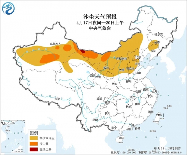 17日夜间至20日上午,新疆、青海西北部、内蒙古中西部、甘肃、宁夏、陕西北部、山西中北部、京津冀等地自西向东先后有扬沙或浮尘天气,新疆吐鲁番盆地和南疆盆地东部、内蒙古西部等局地有沙尘暴或强沙尘暴。17日夜间至18日沙尘天气主要影响新疆、内蒙古西部和西北地区;19日至20日影响内蒙古中部和华北等地。