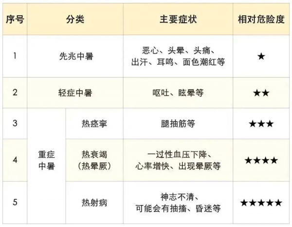 从临床表现来看,中暑由轻到重可分为3大类:先兆中暑、轻症中暑、重症中暑。