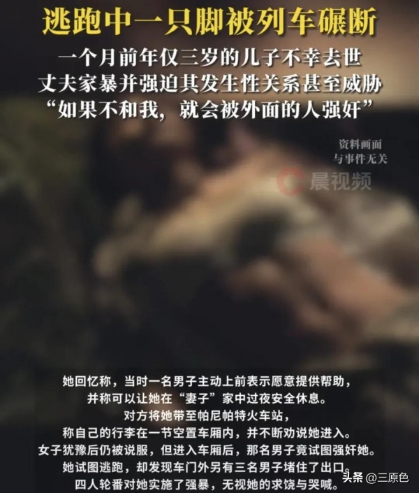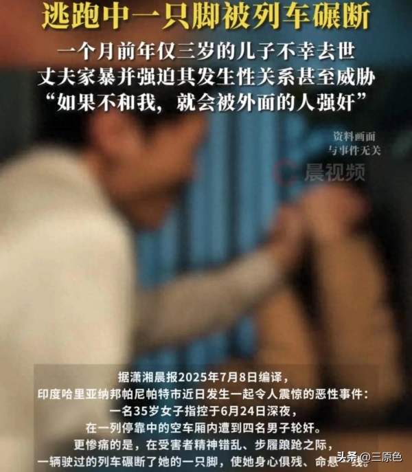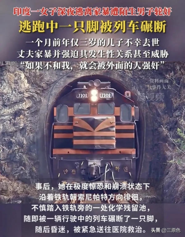7月8日,据潇湘晨报·晨视频报道,6月24日,印度一女子深夜因家暴逃离,遭到陌生男子轮奸,逃跑中一只脚被列车碾断,一个月前,女子年仅三岁的儿子不幸去世,丈夫家暴并强迫其发生性关系,甚至威胁"如果不和我,就会被外面的人强奸"。