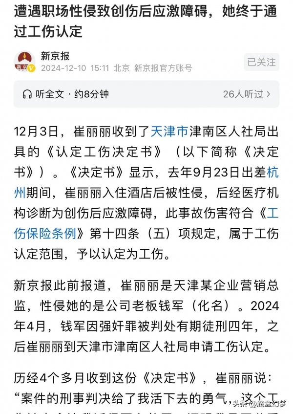 崔女士身心受创,申请工伤。人社局批准了。理由是:工作期间,因工作原因受伤。这说法,听着有点儿别扭,但法律上好像能说得通。