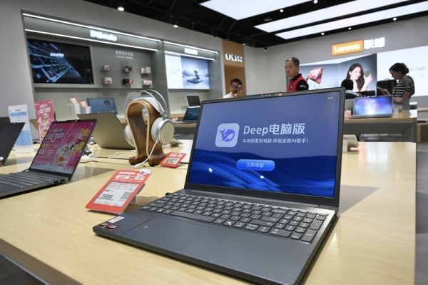 2025年11月23日,中国深圳:2025年11月23日,深圳某商店展示联想笔记本电脑中运行的深度求索AI程序。 IC Photo