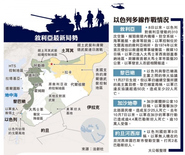 8日以来,以色列对叙利亚发动约310次空袭,摧毁叙境内机场、防空系统、海军舰艇、仓库等设施;以军控制位于戈兰高地的叙利亚哨所,自1974年以来首次侵占以叙边境军事缓冲区。叙媒10日称,以军已进入大马士革西南部盖泰纳地区,距离叙首都大马士革市区仅20公里。以军发言人否认相关报道。