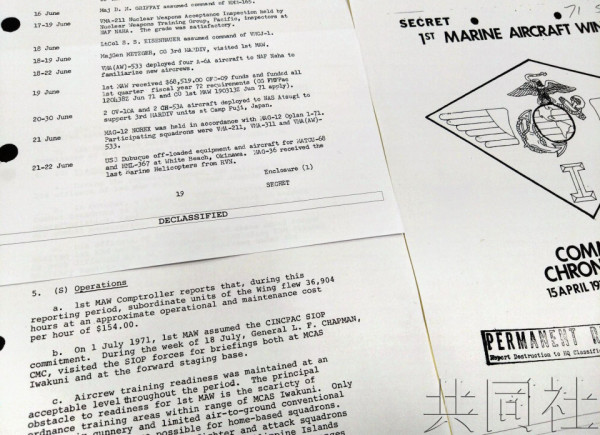 报道称,这份被解密的文件是美军在1970至1974年的官方记录,由司令部设在岩国的第一海军陆战航空团及其下属部队制作。这份文件此前保存在美国国家档案馆。