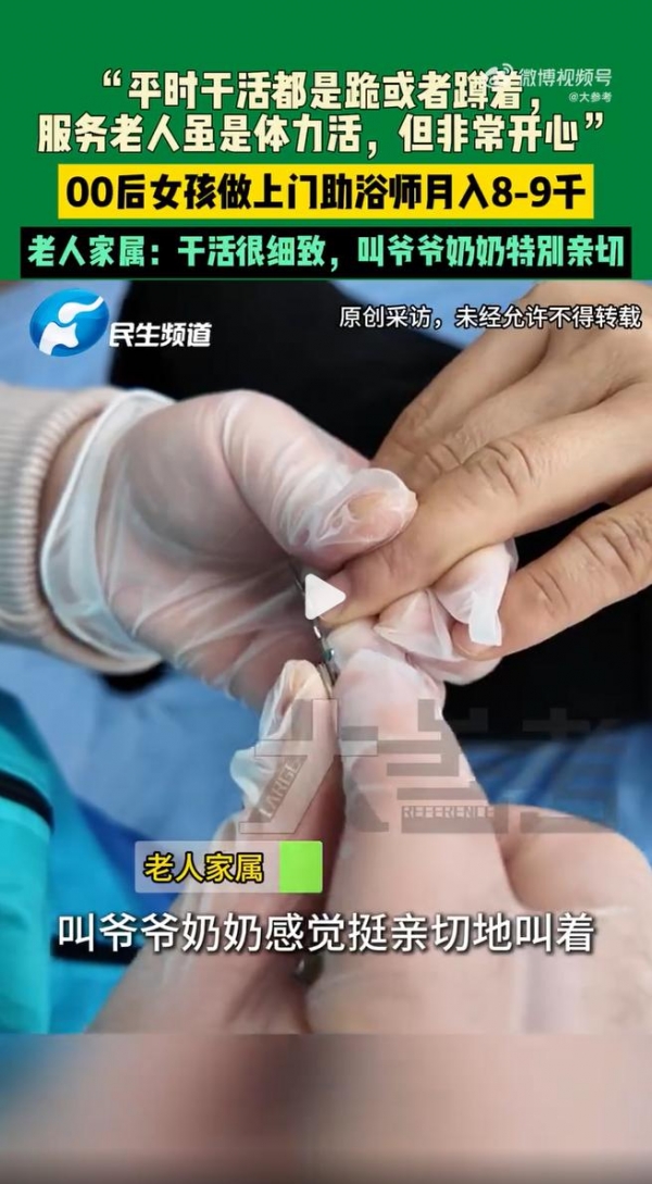 "这闺女比亲孙女还亲!"河南郑州的王奶奶攥着小于的手,眼眶泛红。04年出生的河南女孩小于,大学毕业后没坐办公室,反而当起了"上门助浴师"--跪着、蹲着给老人洗澡、护理,月入8-9千,高峰时近万!她笑说:"体力活是累,但听到老人说'舒服',比发工资还开心!"