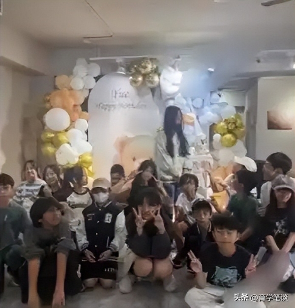 在生日会现场,小玥儿站在主题画面中间,穿着白色卫衣,长发披肩,笑容灿烂,和同学摆各种手势拍照,能看得出大家都很快乐。