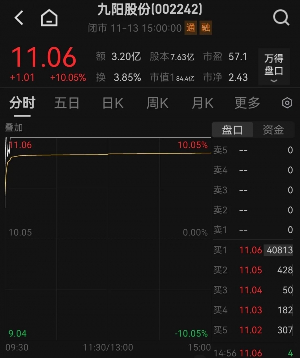 值得一提的是,伴随着"哈基米南北绿豆"豆浆的爆火,11月13日早盘,九阳股份开盘直线拉升,封死涨停,股价报11.06元。