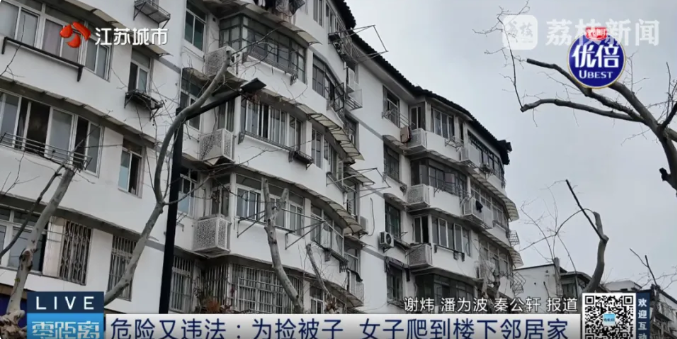 朱先生认出,这名女子是住在楼上的章女士。章女士表示,当天晒在阳台的被子掉到了楼下朱先生家,她到朱先生家敲门却无人应答。她上楼观察后,决定从洗手间窗户出去,爬到楼下捡被子。