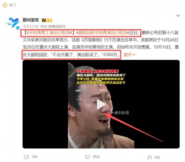 在10月10日,重庆大剧院回应:"不会开票了,演出取消了"。就在此前,"辛柏青复工"等相关话题也曾频频登上热搜,众多网友留言表达支持,希望他能够重新振作起来,期待他能借这部作品也早日重返剧场。