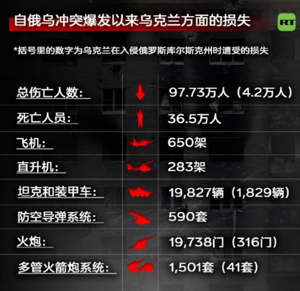 俄方还发布了一份统计报表:自2022年冲突爆发以来,乌军总伤亡人数高达97万,阵亡人数36万,其中2024年乌军伤亡超56万。另外,乌军的坦克、装甲车、火炮这些地面重型武器的损失也相当惊人,总数高达5000辆以上。