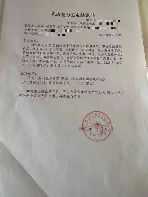 经过80多天的等待,12月17日,崔丽丽告诉记者,她因职场暴力导致精神障碍的工伤认定,终于有了法律上的"伤残等级"--十级伤残。