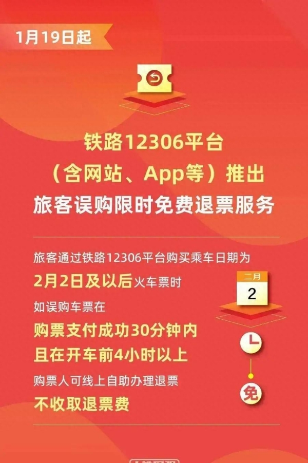 从1月19号开始,只要你在12306平台买的是2月2日及以后的车票,如果不小心买错了,满足两个条件就能免费退:第一,购票支付成功后30分钟内;第二,距离开车时间在4小时以上。