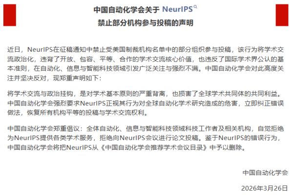3月26日,中国自动化学会发布关于NeurIPS禁止部分机构参与投稿的声明:
