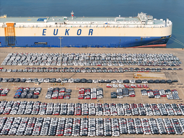 山东烟台,国产汽车在烟台港集结,并通过汽车运输船出口。 视觉中国