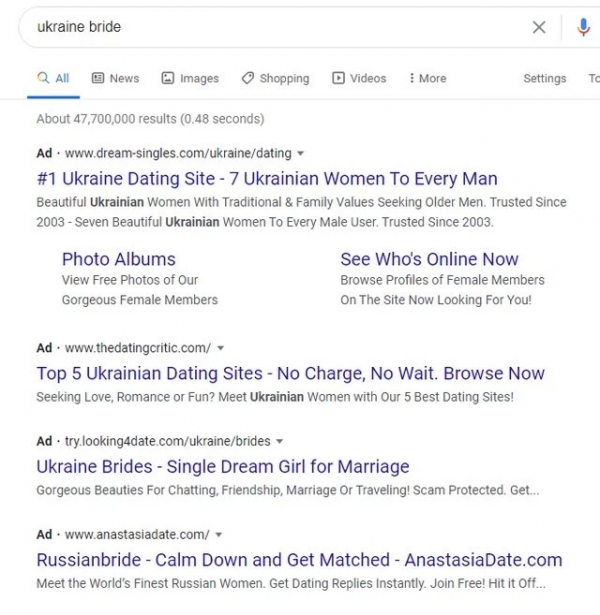 在谷歌搜索“乌克兰新娘”的时候,前四条,几乎都是国际婚庆所的广告。