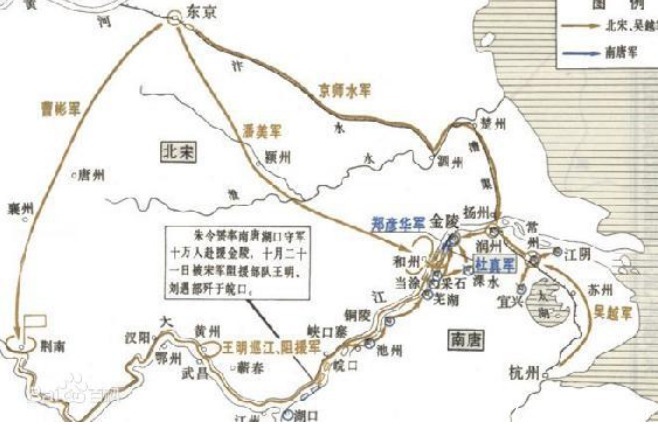 ▲宋灭南唐之战 虽然宋军在长江南岸占领了许多城池,但水军未必能阻挡鄱阳湖的朱令赟水军南下驰援金陵。然而在赵匡胤的正确战略牵制下,朱令赟迟迟不敢行动,直到润州丢失之后,才率水军数万,号称十五万入援。宋将王明望之生畏,急报赵匡胤,要求尽快制造大船,抵抗南唐水军。但就在这时,赵匡胤展示出了过人的战略指挥能力,判断出现在造船远远来不及,朱令赟部行动迅捷突然,己方水师未曾全面集结,不是朱令赟对手,一旦朱令赟到达金陵城下,金陵之围将被解。于是赵匡胤亲自命令王明在洲浦之间多立长木,如同船帆、桅杆一般,朱令赟怀疑有埋伏,因此逗留多日,失去了宝贵的时间。不然,朱令赟很有可能将分散在江面上巡弋的北宋水军各个击破。