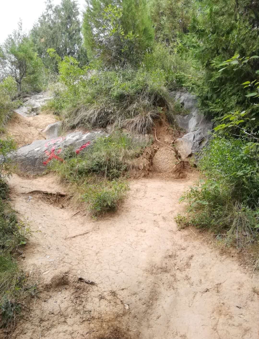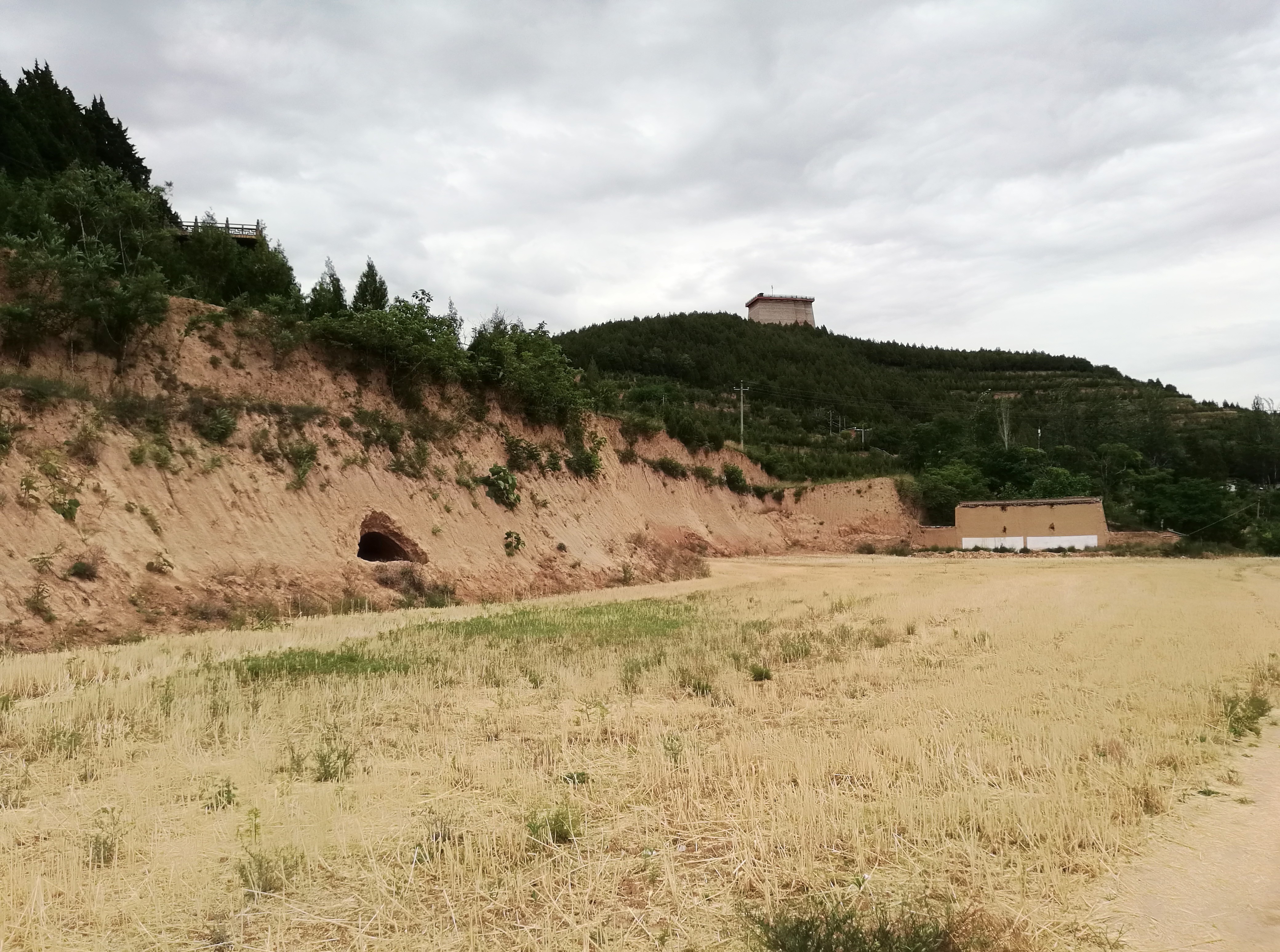 墓道口就在这,石头上有凿子凿下的痕迹,这就是唐代人修墓道时凿下的痕迹。这是墓道西边的一个边,墓道就在这底下打有一个隧道,他把唐高宗李治和女皇武则天两个皇帝埋在了这里。唐代时没有机械化,全靠人力修建。这个墓道口在60年代就找到了,60年代我们国家把墓道从这里打开了,打开以后经过考古勘察,说乾陵墓道是两部分组成,第一部分是露天,第二部分是石洞。