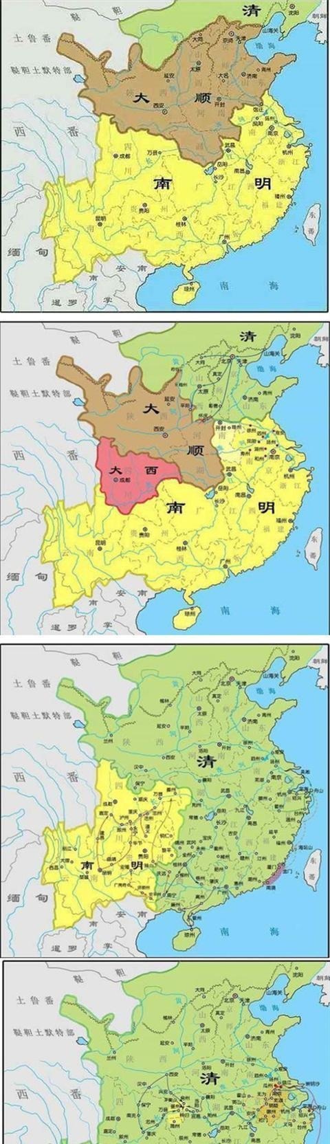 1644年,李自成灭了明朝。此后在内地出现了弘光、隆武、永历等南明政权,北方有李自成的"大顺",四川有张献忠的"大西",如此军阀割据,十分危险。他们相互征战,展开了远交近攻的游戏。而俄罗斯已经占据了更多的蒙古地区。不过清朝的入关很快消灭了这些政权。1664年,清朝统一了内地大陆地区。康熙时期(1662-1722年),清朝的疆域继续迅速扩大。
