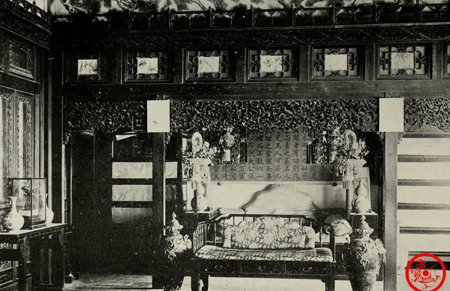 养心殿内慈禧太后的座椅。Burton在紫禁城内拍照时,慈禧太后正躲在西安,北京的烂摊子交给直隶总督李鸿章、庆亲王奕劻等人处理。