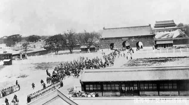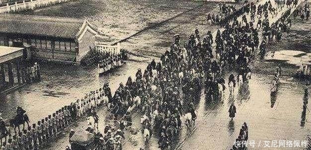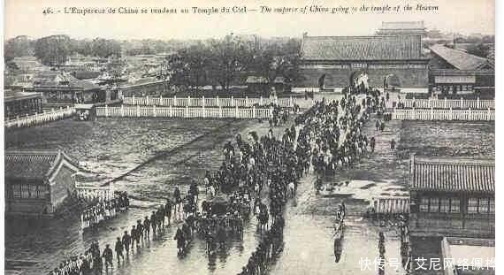 1905年光绪皇帝出行在北京大街上:此时的光绪因为戊戌变法的失败,和慈禧发动的政变,已经失去全部的实权,属于被囚禁的状态。所以相对而言,他的排场其实是小很多的,一是因为他本身是皇帝中比较节俭的,另外就是慈禧对他严格控制。照片中这次出行是光绪要去天坛举行一年一度的祭天仪式。但是从照片我们可以看出,到底还是个天子,场面还是不小的。两旁都是排列整齐的侍卫,先行的是三匹白马,负责先行开道。光绪的轿子紧跟其后,他的轿子是是真正的八抬大轿。轿子两侧还有带刀侍卫保护,在后面就是浩浩荡荡的仪仗队。