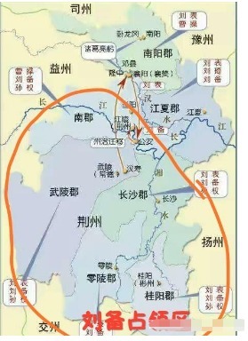 赤壁之战后,刘备先是攻取了荆州南部四郡,然后又从孙权手中获得了南郡(个人认为是刘备以江夏作为交换而得到了南郡),此时的刘备占据了荆州地区的五个郡。而这时的荆州实际上只有七个郡,(南阳郡、江夏郡、南郡、武陵郡、长沙郡、桂阳郡、零陵郡),也就是说刘备占据了整个荆州的七分之五的面积,如下图所示。
