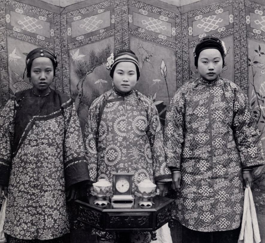 这是清朝1906年民间三位普通人家的女子合影,据历史记载,清朝女子无论尊卑都习惯在额头上戴着抹额,即便是侍奉主子的丫鬟,平日里亦是喜欢戴抹额出行,可见清朝女子对抹额的喜爱程度有多深。