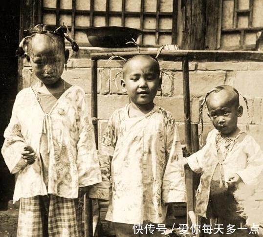 晚清老照片:三位扎着小辫子的小孩出现在镜头前,他们穿着朴素,虽然没有大富大贵那样的小孩穿丝绸锦缎,不过在当时能够有衣服穿还是比较不错的了,因为在晚清时期,衣不遮体的家庭太多了。