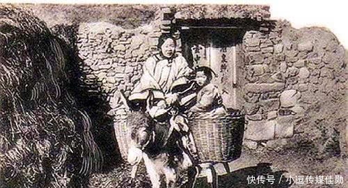 图为清末时期老照片,照片中是一个骑驴的妇人,妇人旁边的框里还坐着一个小孩,看样子像是准备回娘家。